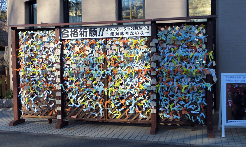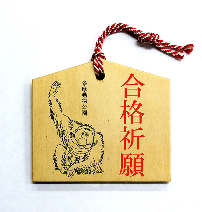 オランウータンは樹上生活をする動物です。木にしっかりつかまり、落ちることはありません。そこで、落ちないオランウータンにあやかり、げんかつぎの特設ブースをオランウータン舎前に設置しますので、絵馬や特製用紙に合格祈願などの願い事を書いて結んでいただきます。