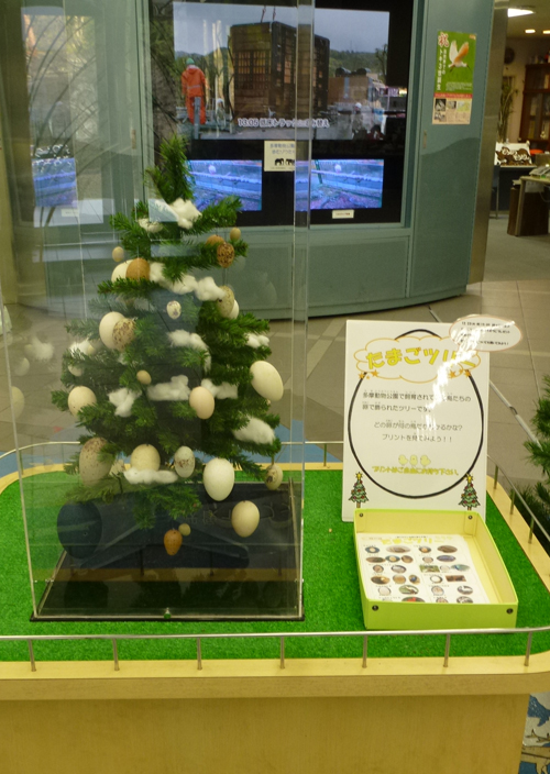 育すう舎で鳥たちが産んだ無精卵をクリスマスツリーに飾りつけました。鳥たちが産んださまざまな卵の違いを、お楽しみください。