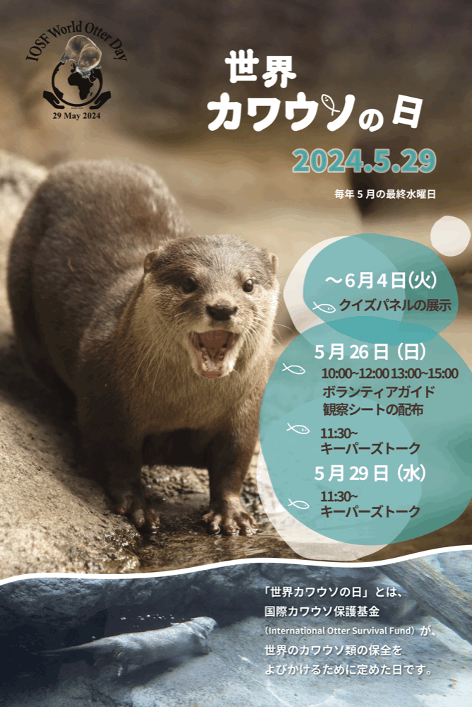 国際カワウソ保護基金(International Otter Survival Fund)が、世界のカワウソ類の保全をよびかけるために定めた日です。この日は世界のカワウソ関係者が、野生のカワウソの現状について広く知っていただくためのイベントや保護に関する活動などをおこないます。