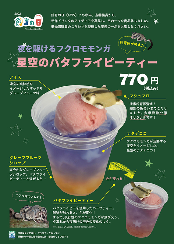 完成したのは、飼育の日ドリンク「夜を駆けるフクロモモンガ 星空のバタフライピーティー」。夜行性のフクロモモンガが夕暮れから夜明けまで飛び交うすがたを、色が変化するバタフライピーティーを使用したドリンクで表現しました。