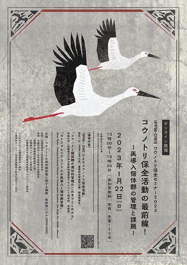 コウノトリの個体群管理に関する機関・施設間パネル(IPPM-OWS:Inter-institutional Panel on Population Management of the Oriental White Stork)は、公益財団法人東京動物園協会との共催で、コウノトリ保全セミナー2023「コウノトリ保全活動の最前線!──再導入個体群の管理と課題」を開催します。ぜひご参加ください。