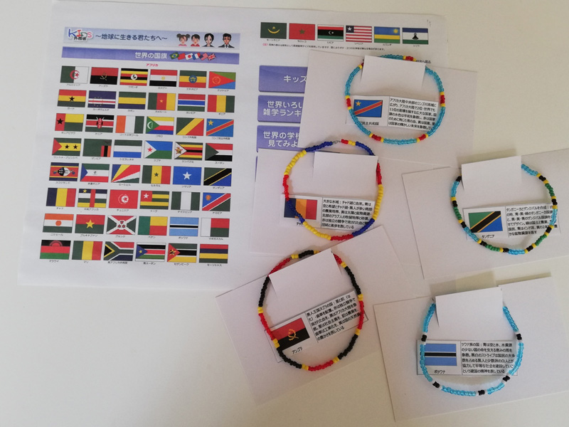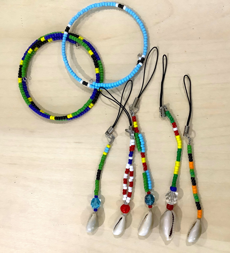 鮮やかなビーズを使ってアフリカ各国の国旗をイメージしたビーズ細工のワークショップです。どなたでも体験できます。ブレスレットまたはストラップのいずれかを選べます。