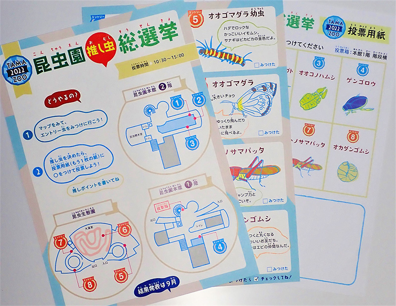 昆虫園で人気の虫の中から8つエントリーしています。エントリーされた虫をよく観察して、「推しポイント」を見つけてみましょう。最後に、あなたにとって一番の「推し虫」を選んで投票してください。総選挙の結果は9月に東京ズーネットで発表する予定です。