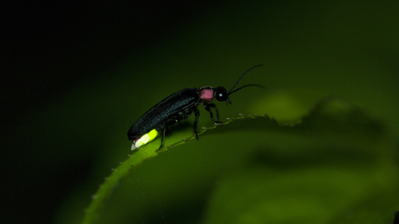 日没後の園内で、ホタルが飛び交うようすや生息環境を観察します。