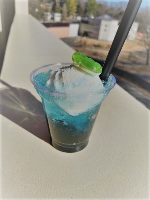 園内に生息するアマガエルの産卵をイメージしたドリンクです。タピオカとゼリーでカエルの卵をリアルに表現しました。上にはヨーグルト味のマーブルアイスとカエルのグミをトッピング。飼育係のアイディアが形となりました。