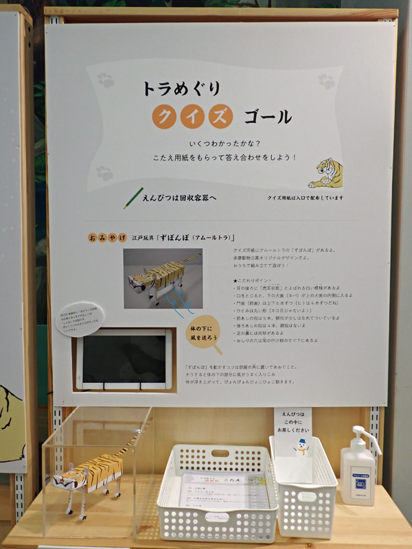 クイズ用紙には江戸玩具の「ずぼんぼ」が付いています。多摩動物公園オリジナルデザインの「アムールトラずぼんぼ」には、こだわりポイントとしてトラの特徴が盛り込まれています。会場でクイズを楽しんだあとは、おうちで「ずぼんぼ」を組み立てて遊んでみてください。