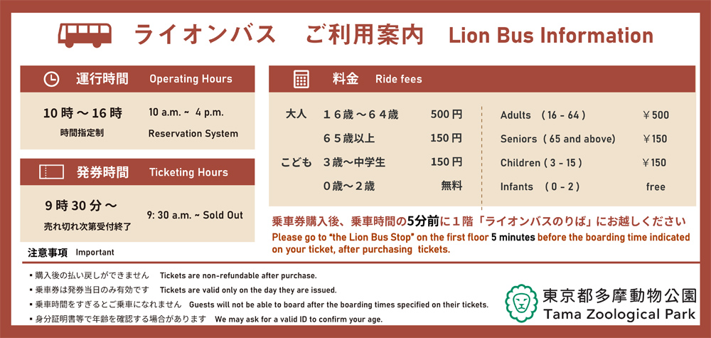 正門を通って入園してからライオンバスステーションまでの道順、チケット購入、バスご乗車までの流れについてはこちらをご確認ください(PDF、約3MB)。
