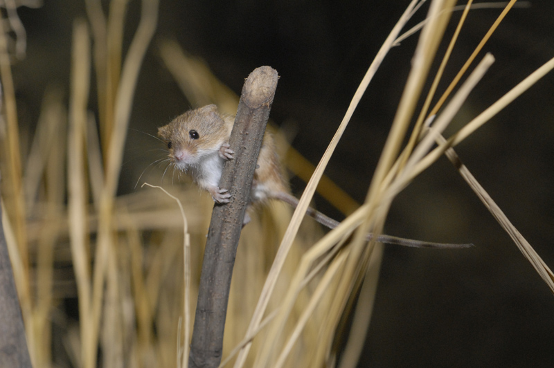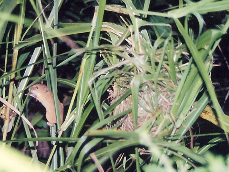 彼らのくらしを守ることは、じつはそれほど難しいことではありません。カヤネズミの魅力やおもしろい生態、そして私たちの身近にくらす野生動物との共生のためのちょっとした工夫について、お話しします。 |  野生のカヤネズミ (撮影:畠佐代子氏) |