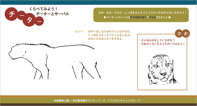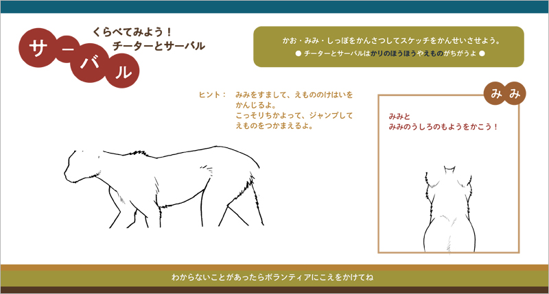 同じネコ科動物ですが、比べてみるといろいろな違いがあります。ボランティアやスタッフといっしょに、いつもとは違った視点で動物を観察してみませんか? きっと新しい発見があるはずです。