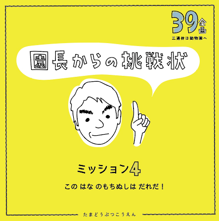 ミッション4のテーマは「鼻」です! 多摩動物公園園長からの挑戦状をみなさんにお渡ししますので、園内をまわりながら手がかりを探し、ミッションをクリアしてください。大人の方もお子さんも、楽しみながら動物の体のつくりやくらしを学べる内容です。