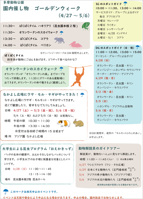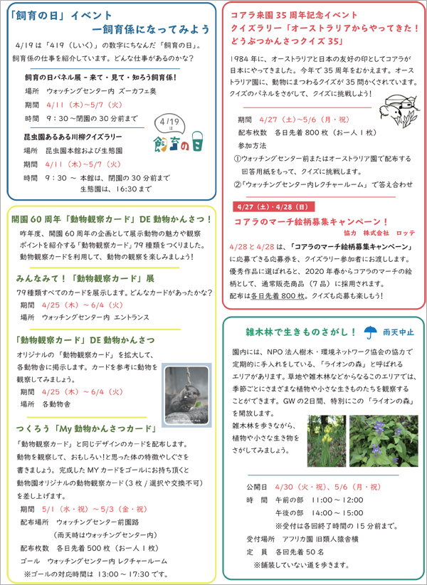 この企画のしめくくりとして、「動物観察カード」を活用した各プログラムを開催します。「動物観察カード」を見ながら動物を観察したり、観察して発見したことをもとに「MY動物観察カード」をつくったり、ゴールデンウィークは動物の観察を楽しみましょう!