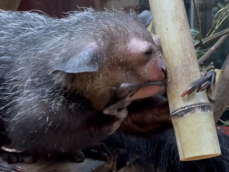 | 使用している給餌器の例:アイアイの穴あき竹筒 | 昨年度の様子 |
