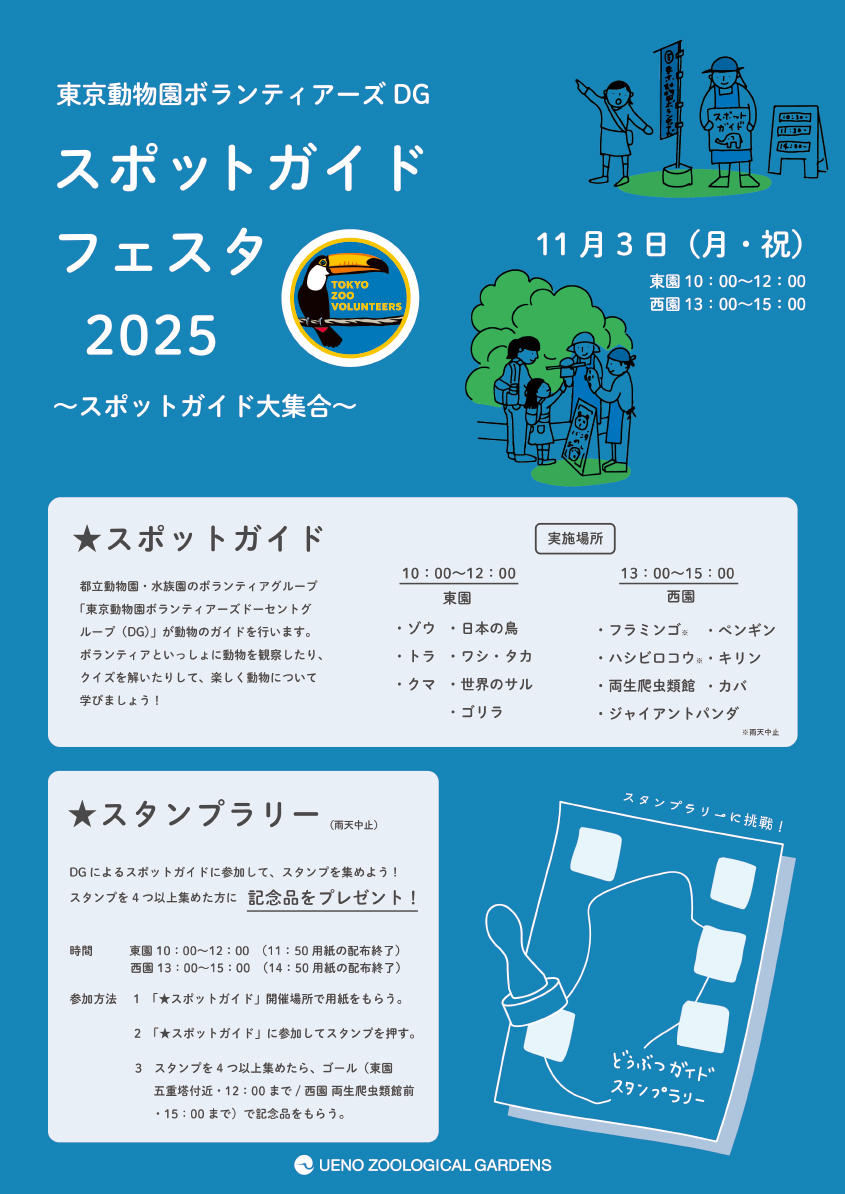 上野動物園で2025年11月3日(月・祝)、「東京動物園ボランティアーズ」のドーセントグループによる「スポットガイドフェスタ 2025──スポットガイド大集合」を開催します。
