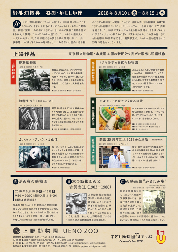 「かもしか座」とは、過去に恩賜上野動物園の園内に実在した映画館です。今回、半世紀前の貴重な動物園フィルム映像をはじめ、都立動物園・水族園4園の短編映像を上映するイベントとして、野外上映形式でねお・かもしか座を実施します。
