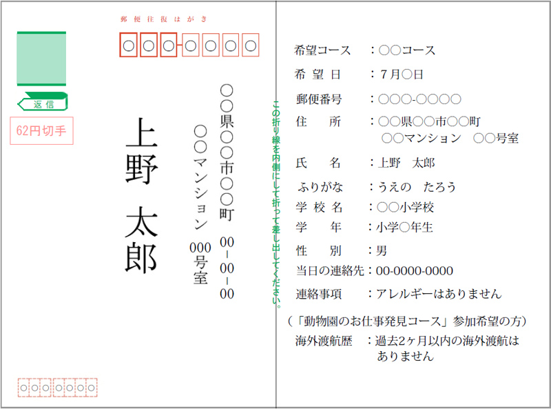 郵便局発行の往復はがきでお申し込みください。往信面に、希望コース名・希望日、郵便番号・住所・氏名(ふりがな)・学校名と学年・性別、当日連絡が取れる電話番号、アレルギーやぜん息などの症状(該当する方のみ)を記入し、返信面に住所・氏名を明記のうえ、以下の宛先までお申し込みください。