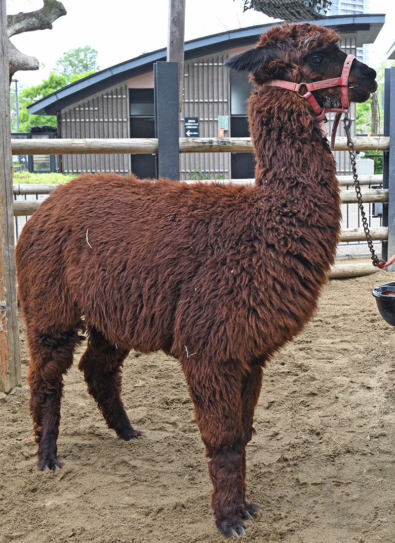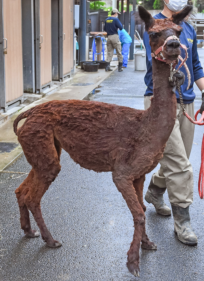 ふたば牧場のアルパカ。毛を刈る前のすがたと毛を刈った後のすがた