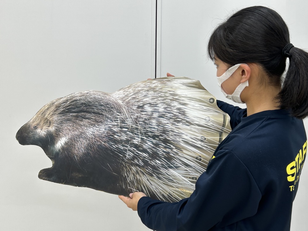 「ネズミのなかまたち」を紹介するコーナーもできました!「小さな動物たちのおうち」でおなじみのモルモットやてのひらサイズのハツカネズミ、それにトゲのあるヤマアラシは、大きさも形もちがうけれど、みんなおなじネズミのなかま。ほんとうの大きさのヤマアラシやモルモットのパネルをもって大きさ比べをしたり、お手持ちのカメラでパネルといっしょに写真を撮ったりすることもできます。