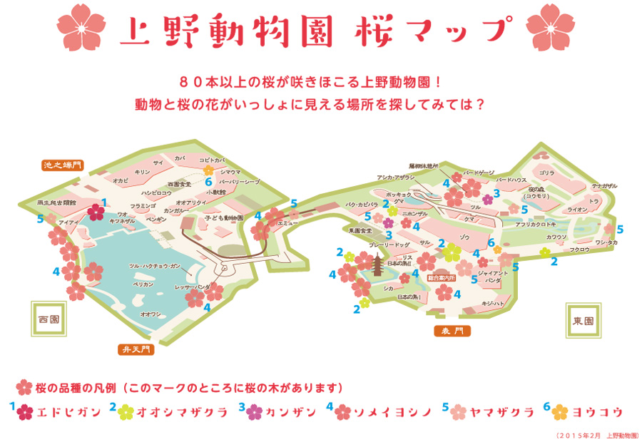 桜の名所でもある上野動物園には桜の木が80本以上もあります!「上野動物園 桜マップ」に基づき、園内の主な桜の見どころと品種の特徴についてご案内します。「上野動物園 桜マップ」は参加者以外にも配布します。また、