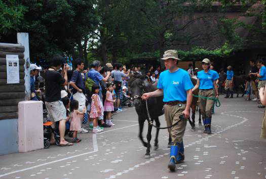 在来馬たちが厩舎へ帰る行進を実施し在来馬について飼育係がお話しします。