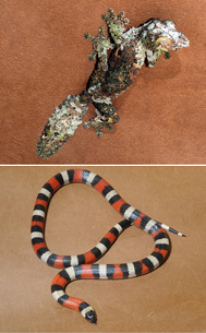 反対に、自分を目立たせることで身を守っているものもいます。ミルクスネークの仲間は、無毒であるにも関わらず有毒なヘビにそっくりな派手な模様で、外敵を欺いています。