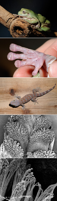 さて、イエアメガエルとトッケイヤモリは、どちらも指先に特殊な構造をもち、垂直面にはりついて、歩くことができます。しかしその方法は、異なることが知られています。