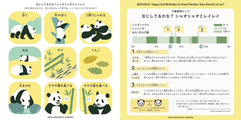 シャオシャオとレイレイにちなんだビンゴカードを配布します。ビンゴカードには食べる、寝る、うんこなど、観覧中に見られる行動やものが9マス分記載されています。よく観察してビンゴを完成させましょう。裏面にはシャオシャオとレイレイに関する情報も掲載しています。
