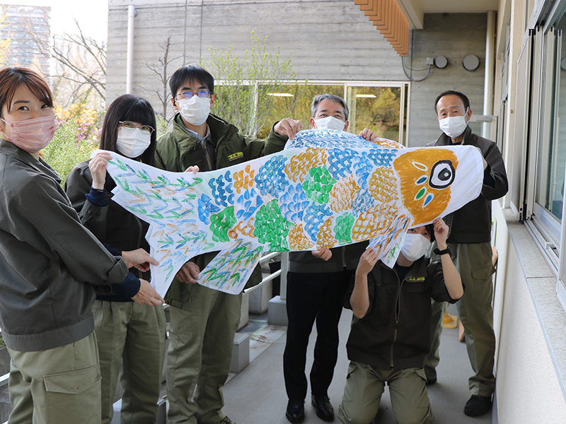 アンケートに回答していただいた皆さまと、動物園職員とでつくり上げたオリジナル鯉のぼり。これからも動物たちのために取り組みを進めていく決意を込めて大空に掲げました。ご来園の際はぜひ鯉のぼりが泳ぐ空を見上げてみてください。
