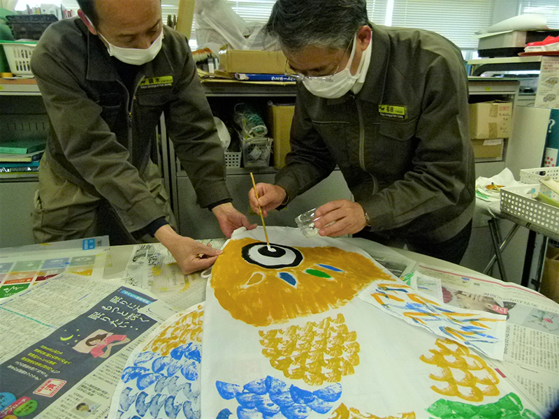 この結果をもとに、白地の鯉のぼりに色付けをおこないました。色付けには、ジャイアントパンダが食べ残したタケと布用絵の具を使いました。パンダはタケの葉の部分だけではなく、かん(茎にあたる部分)も食べます。タケの稈は、ひとつひとつ太さや厚み、硬さが異なっており、かんを食べるときにパンダの歯にかかる負担を少しでも軽減するために、毎日飼育係がナタを使ってタケを縦に割っています。この割られたかんをスタンプのように使用してみたところ、半月型の模様になり、鯉のぼりのウロコを表すことができました。アンケート結果に応じた色の割合になるように、それぞれの色をスタンプする回数を数えながら色を付けました。制作は、園長をはじめ動物園で働くさまざまな業種の職員がおこないました。