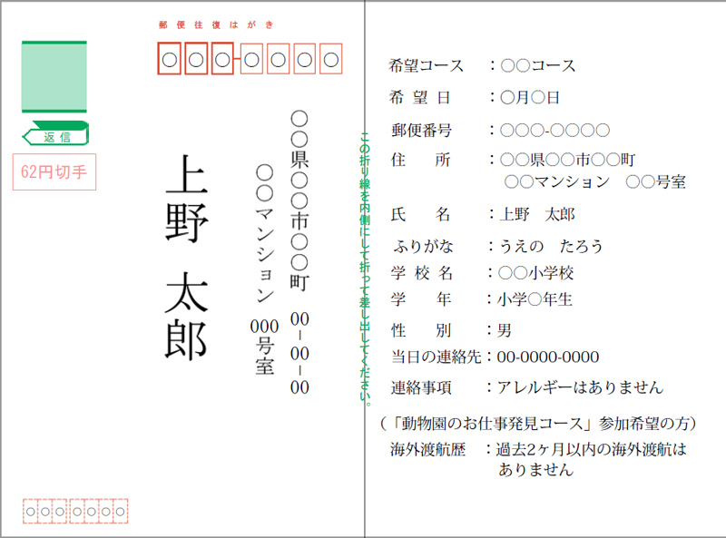 往信面に、希望コース名・希望日、郵便番号・住所・氏名(ふりがな)・学校名と学年・性別、当日連絡が取れる電話番号、アレルギーやぜん息などの症状(該当する方のみ)を記入し、返信面に住所・氏名を明記のうえ、以下の宛先までお申し込みください。