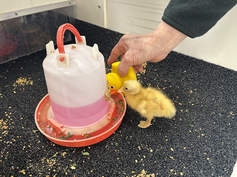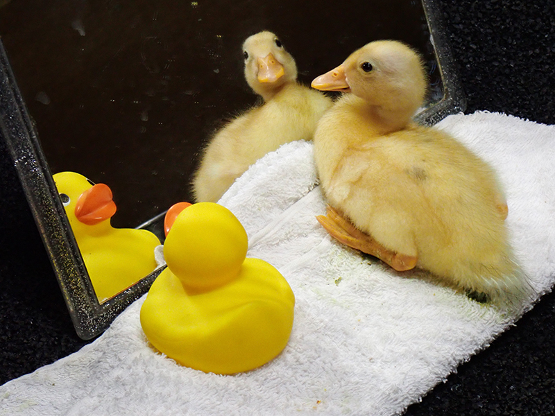 ひなは、まわりのものをなんでもつついたり、まわりの個体の行動を学習し同じ行動をとったりする習性があります。ひなが2羽以上いると競争するかのようにえさを食べるようになるのですが、今回孵化した3羽のうち1羽は単独での孵化だったため、なかなかえさを食べませんでした。そこで、通常は粉末で与えるえさを練りえさ状にして給水器などにはりつけたところ、よく食べるようになりました(写真1)。また、落ち着かないようすのときは群れる習性を利用して、鏡やアヒルの人形を置いて仲間がいるように思わせ、安心できるようにしました(写真2)。