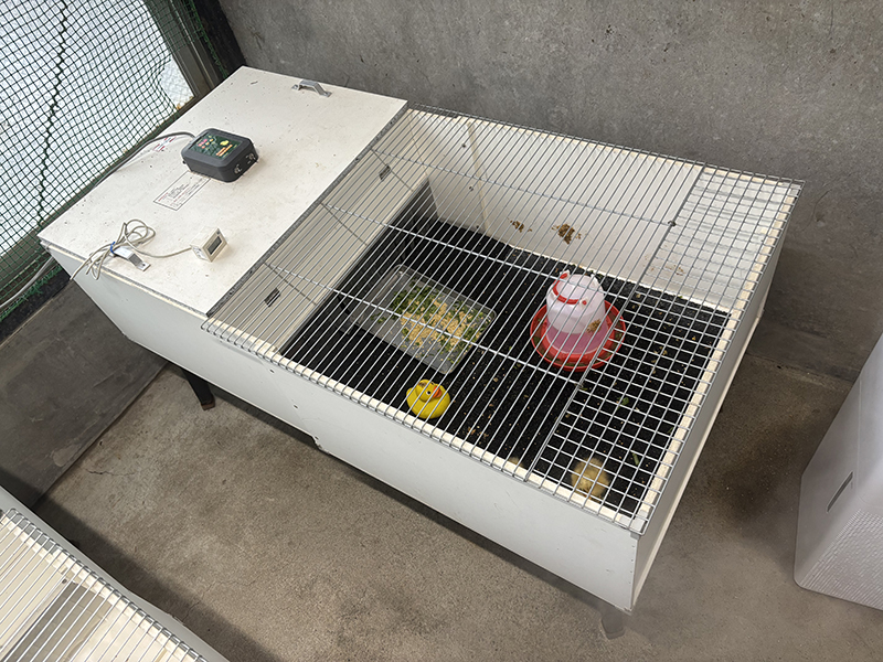 孵化後1か月程は羽毛の保温機能が未熟なため、しっかりと温める必要があります。最初の10日間はヒーター付きで温度を調節できる「育雛箱」というケージを使いました(写真3)。