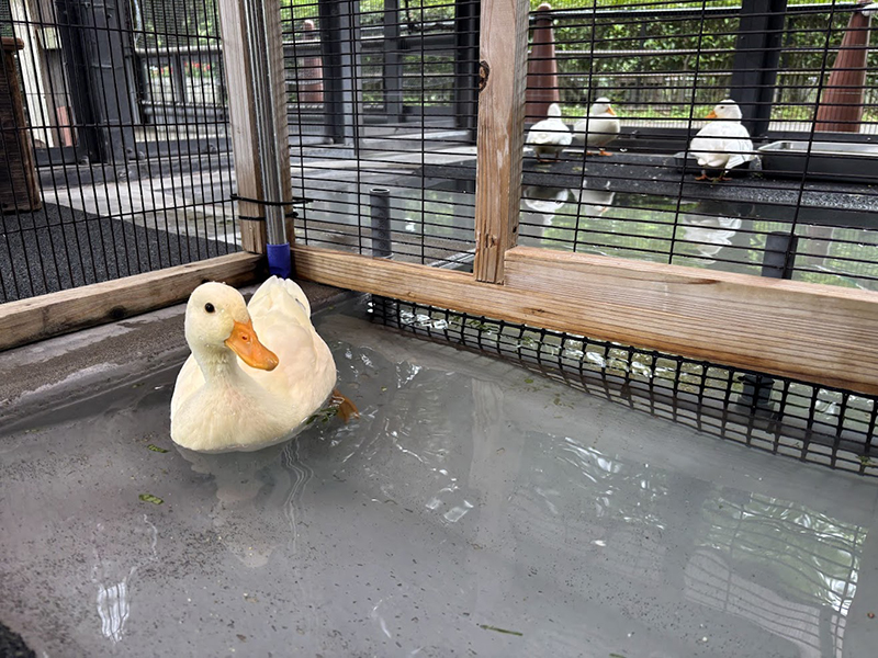 現在、ひなたちは順調に成育し、コールダック舎で群れと柵越しにお見合いをしています(写真5)。ひなの成長は早く、2か月経つ頃には成鳥と変わらないサイズになります。ひなの特徴であるやわらかな黄色い羽毛もその頃にはすっかりおとなのしっかりとした羽毛に生え変わり、その後1〜2か月かけて羽毛の色が黄色から白へと変わっていきます。黄色い姿が見られるのは今だけなのでぜひ早めに会いに来てください。