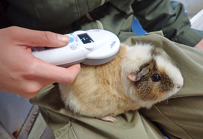 長く飼育を担当していると、容姿などの特徴から個体識別ができるようになり、名前も覚えることができます。しかし誰でも個体を間違えない方法として、モルモットにはマイクロチップを入れています。このマイクロチップには一つ一つ異なる番号が記録されており、専用の機械を使って、番号を読み取ることができます。