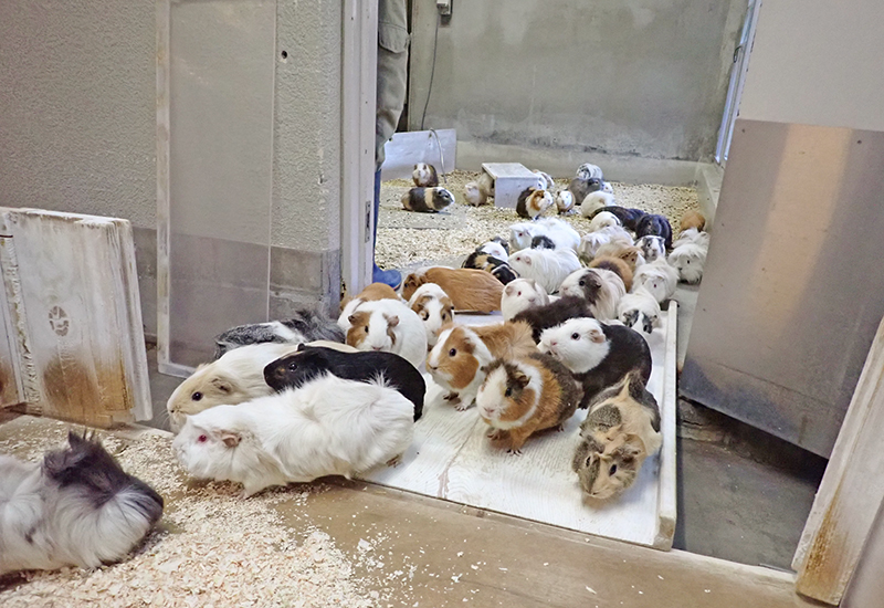 ふれあいプログラムで活躍しているモルモットたちは約130頭です。群れで飼育していると個々の体調の変化に気がつくことが難しいことがあります。その変化を見逃さないようにするために、夜間すごした寝部屋から外に出る「出舎」時は注意深く観察しています。