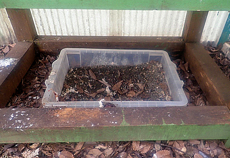 そこで、翌2022年は砂利を入れて雨水が溜まらないように雨対策をしました。さらに底に穴をあけた衣装ケースを抱卵場所として用意しました。ペアが警戒しないか心配しましたが、この場所で産卵し、抱卵もするようになりました。しかし、この卵は無精卵だったため、孵化することはありませんでした。