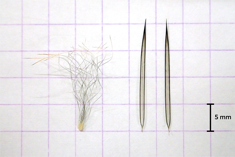 ふつうの毛(左)と薄いプラスチックのような柔らかさのトゲ状の毛(右)