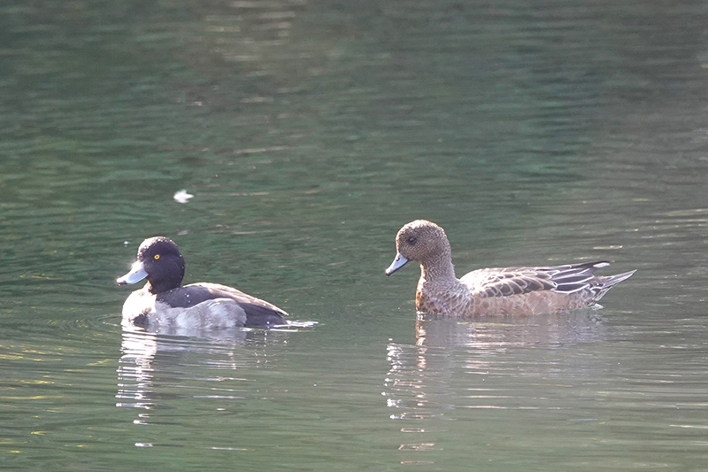 カモには採食方法の違いによって、泳ぎながら水面付近の水草などを食べる「水面採食性カモ」と水中に潜ってえさを取ることができる「潜水採食性カモ」に分けられ、ヒドリガモは前者で、キンクロハジロは後者にあたります。