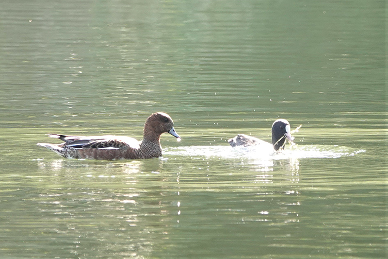 ちなみに、ヒドリガモはキンクロハジロだけでなく、同じく冬に井の頭池に飛来する潜水採食性のオオバンからも同じ方法で水草をもらっていました(写真3)。時にはくちばしから直接奪い取ることも。ヒドリガモが身につけた、効率的に水草を取る採食方法に水鳥の環境適応力の高さを感じました。