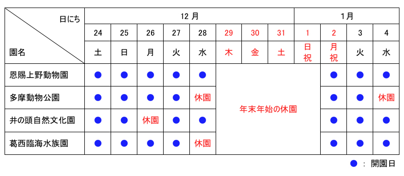 都立動物園・水族園は年明け2023年1月2日(月・祝)から開園します(開園時間は9時30分)。年末年始の日程は以下のとおりです。