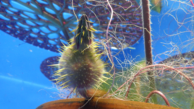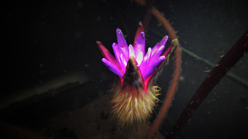 そして、夏から秋にかけて、オニバスは紫色の花を水面上だけでなく水中にも咲かせます(開放花)。さらに、水中にはつぼみの状態のままの「閉鎖花」が多く現れ、きちんと種を実らせます。不思議ですね。水中で、しかも蕾の状態で受粉するのです。この閉鎖花は、開放花と比べて、より確実に多くの種をつくることができます。