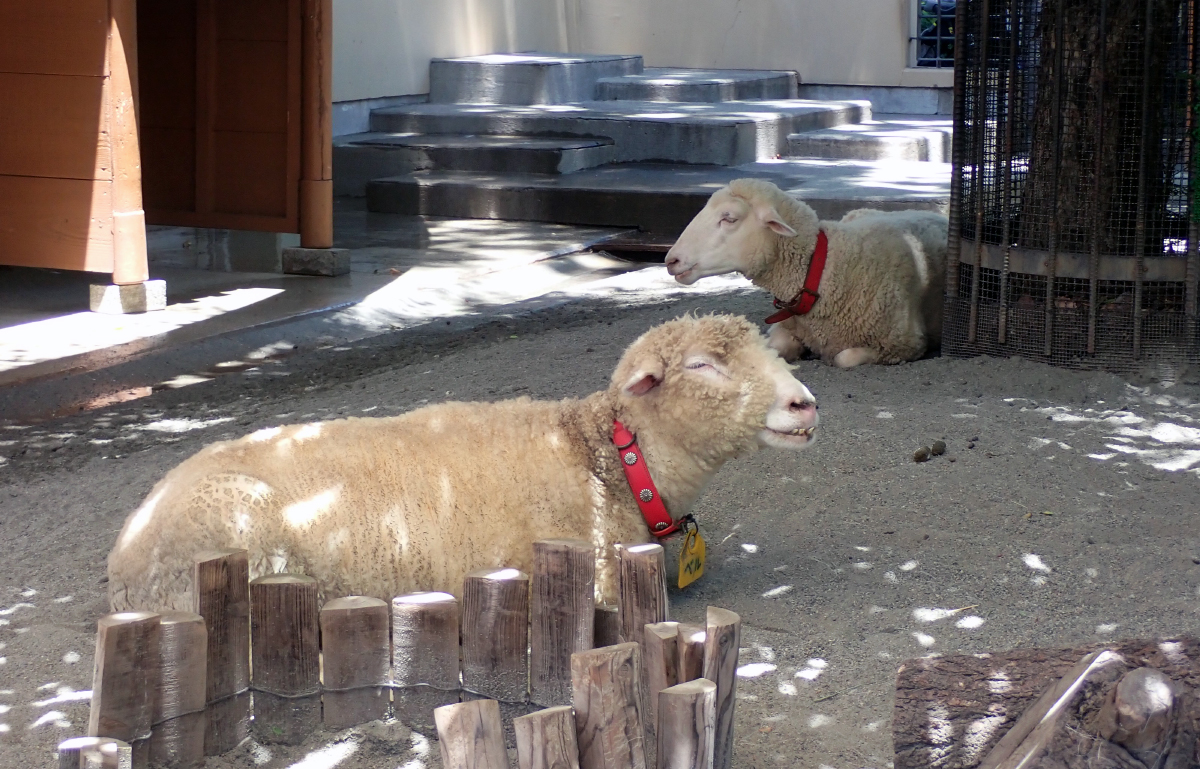 翌朝にはメリダを運動場に出して他のメンバーと合流させました。ヤギ2頭は最初驚いたようすでしたがしだいに落ち着き、メリダはベルの後をついて歩くようになりました。2頭のヒツジは運動場でもいっしょに行動していることが多く、そんなすがたを見ると微笑ましく思います。メリダはヤギやニワトリとの対面もなんなくこなし、1か月たった今ではすっかりなじんだようで、ベルとのんびり休憩するすがたがみられます。