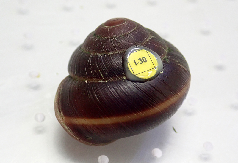 現在飼育する約150個体の中から何個体かご紹介しましょう。2017年に小笠原から来た30個体のうち1個体が今も生きています。この個体は小笠原の施設内で孵化した個体で、今年の6月27日で孵化から丸8年を迎えました。5~6年が寿命と言われるカタマイマイにおいて大変な長寿個体です。