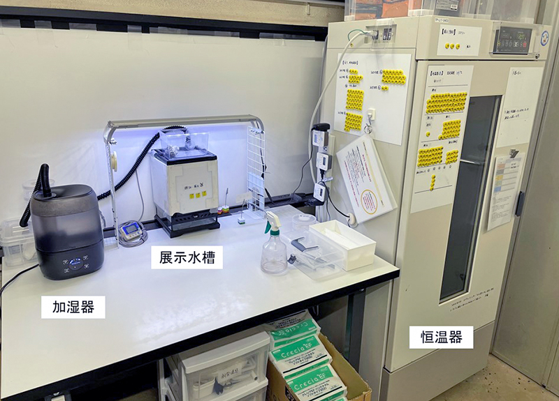 マイマイは身体の乾燥を防ぐために殻に閉じこもることが多いため、できるだけ動いているカタマイマイを来園者にお見せできるよう、展示水槽には加湿器をつなぎ、定期的に湿度を上げてカタマイマイが動きやすい環境を作っています。しかし、マイマイは暗いときに活動することが多く、湿度を上げるだけではなかなか動いてくれません……。温度や明るさも少しずつ調整してくふうを繰り返しています。