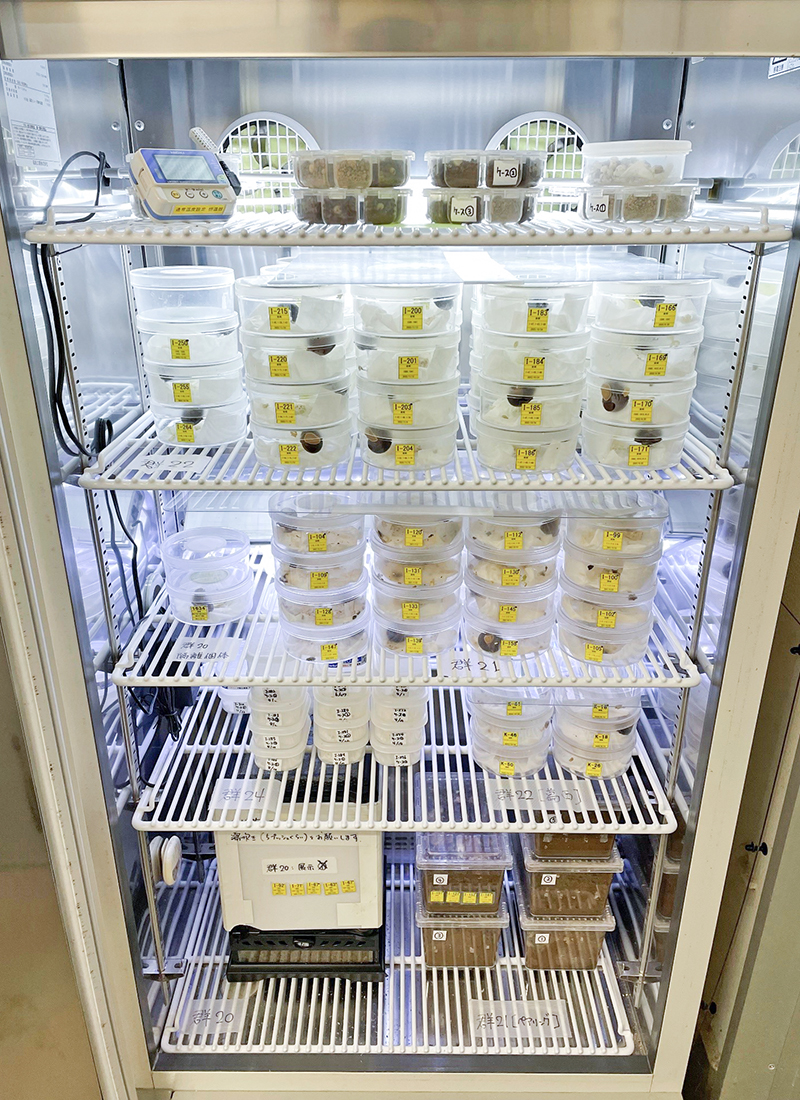 バックヤードでは、カタマイマイを繁殖させるとき以外は専用の飼育ケースに1個体ずつ入れて丁寧に管理しています。すべての飼育ケースは恒温器と呼ばれる温度を一定に保つ機械に収容しています。
