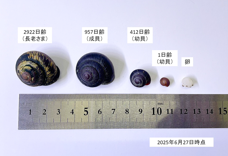 通常カタマイマイは孵化から2年ほどでおとな(成貝)になり、殻のふちが外側に反り返っていると成貝になった証です。また、卵から孵化した直後のカタマイマイは1cmにも満たない大きさで、しっかりと殻を背負って産まれてきます。小さい幼貝や卵はつぶさないよう、専用のピンセットで丁寧に扱っています。