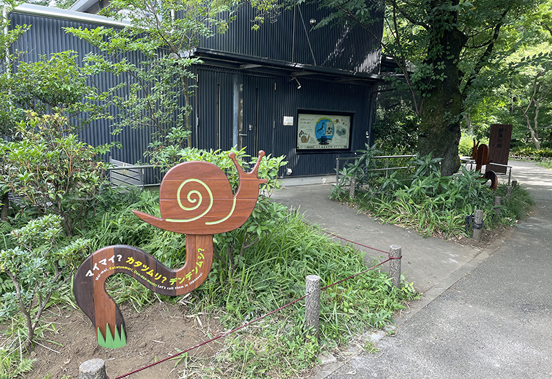 井の頭自然文化園の展示場前に、新たに大きなマイマイ看板(2か所)を設置しました。この看板を目印に小笠原の希少なマイマイに会いにきてください。