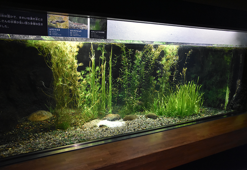 この展示では、かつて湧き水が豊富であったころの井の頭池の環境を再現していこうと考えています。現在、湧水の環境を代表する動植物として、水草では清流のシンボルと呼ばれるバイカモ、魚ではかつて井の頭池にも生息していたムサシトミヨとホトケドジョウの展示を始めています。