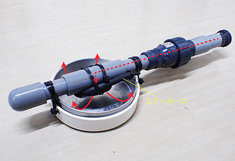 パイプの出口は皿の中央付近に水流があたる位置にあり、飼育水が下向きに細く勢い良く流れ、皿にぶつかることで水流は幅広く分散し適度な勢いになり上に向かいます。さらにパイプ出口付近にはエアーホースを付けており、小さな空気の気泡を出す仕組みにもなっています。