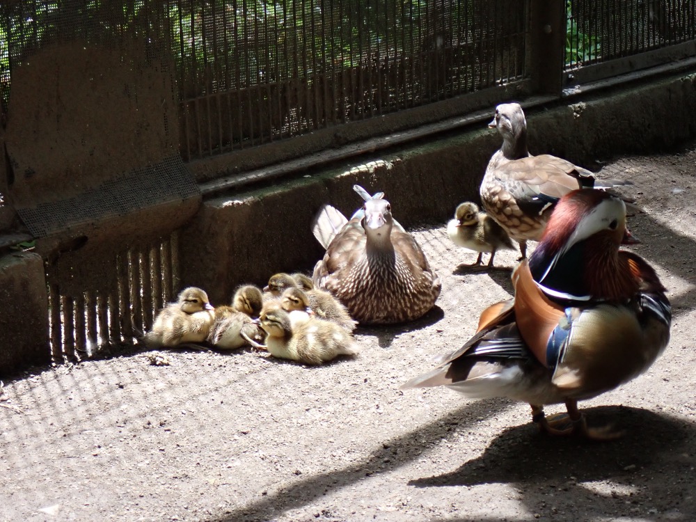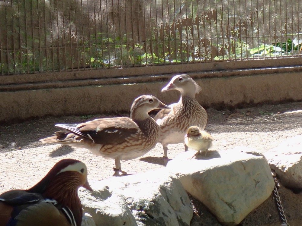 どちらの母鳥が子育てをするのかな、きちんと自分の子として子育てしてくれるのかな、と担当の私はあれこれ考えていましたが、それは杞憂に終わりました。2羽はひなを他のオシドリたちからしっかり守りながら、母母子の3羽で行動していたのです(写真1)!