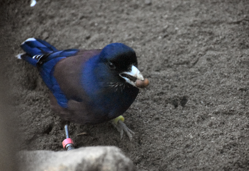 当園のルリカケスはドングリがとくに好きらしく、今年の秋に初めて与えた際には、ふだんのえさはそっちのけで、すぐにドングリを口へ入れて運び、地面に隠しました。これは、「貯食」という行動で、寒い冬を乗り切るために種子などを隠しておく行動です。春に来園してから、秋に初めて貯食行動をしはじめ、地面に隠したものを取り出して大事そうに食べています。